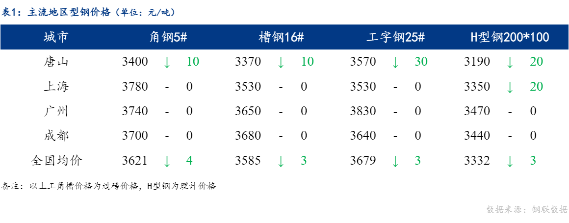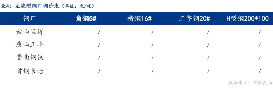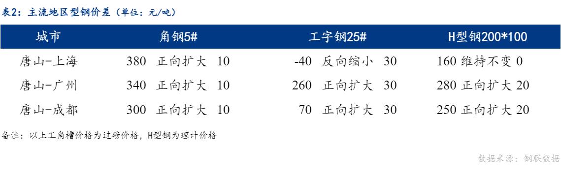 从区域价差来看,唐山到上海、广州与成都的角钢价差正向扩大;唐山到上海工字钢价差反向缩小,到广州与成都价差正向扩大;唐山到上海H型钢价差维持不变,到广州、成都价差正向扩大。