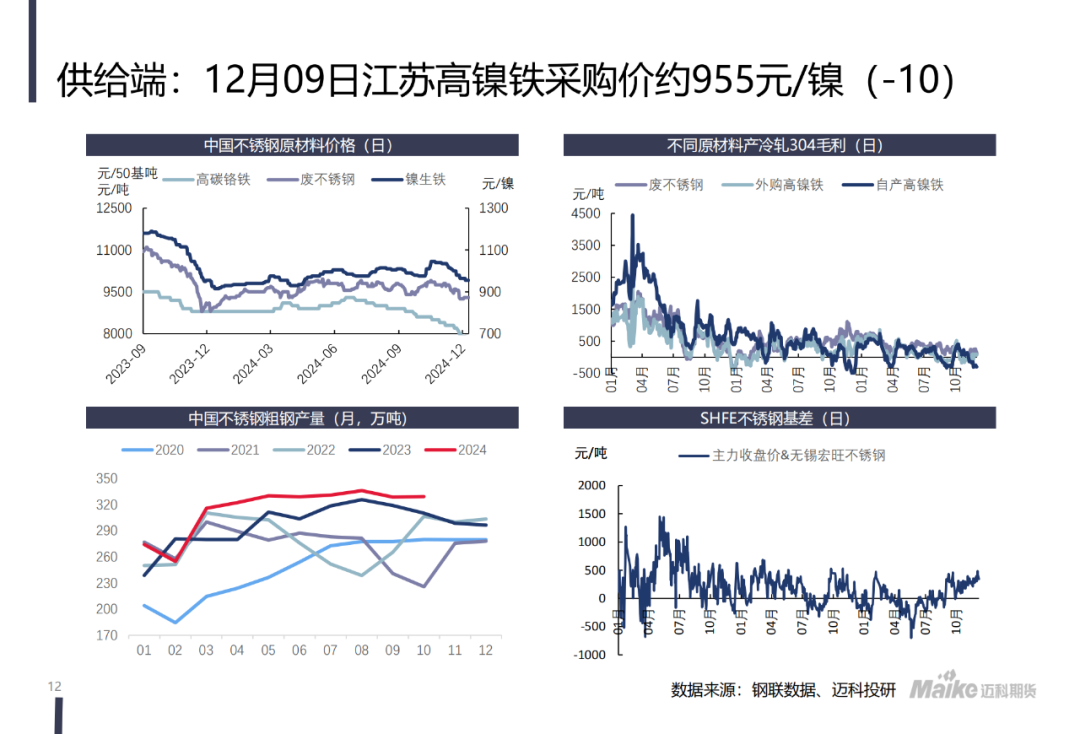 你好,镍生铁,纯镍,以及废不锈钢是不锈钢中镍的主要来源,镍是不锈钢最主要的成本之一,两者价格存在相关性。目前由于不锈钢生产工艺改变以及电解镍体现动力电池溢价,镍期货的合约标的电解镍价格与不锈钢价...