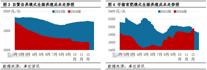 而与自繁自养模式不同,仔猪育肥模式除包含饲料成本、人工水电防疫等费用外,相对固定的仔猪保育成本则变为仔猪外购成本。当前出栏的仔猪育肥模式的生猪,所补栏的多为5-6个月前购入的仔猪,8月份仔猪育肥模式的养殖成本快速升高,主要原因是仔猪补栏成本提高,这也是仔猪育肥盈利下降的转折点早于自繁自养模式的主要原因。2024年仔猪育肥模式的成本先降后涨,最低点出现在4月中旬,此后震荡上涨,最高点出现在12月初,期间累计上涨34.14%;年均值同比下降17.49%。