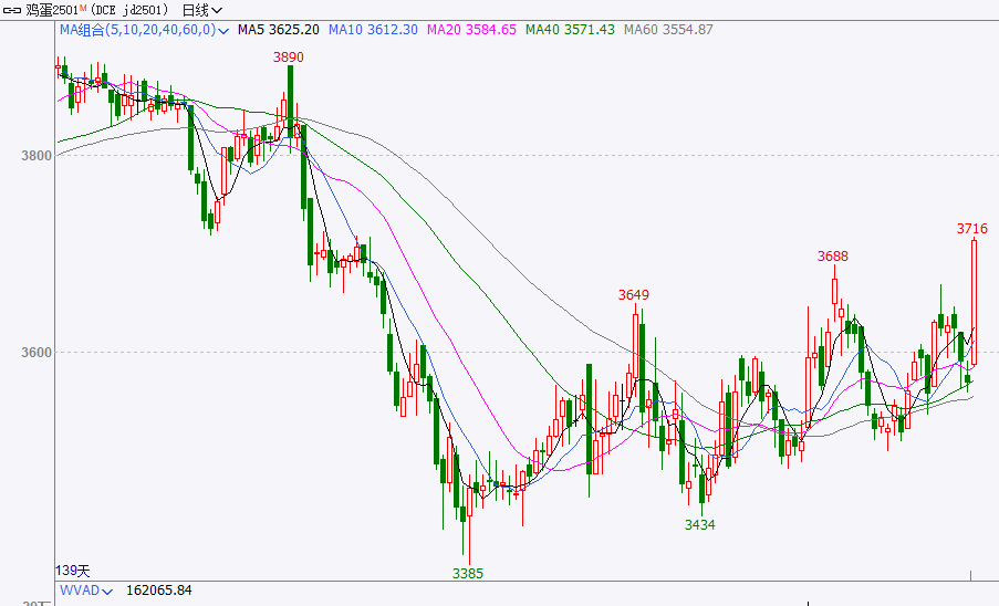 鸡蛋主力合约整体呈现震荡上行走势,涨幅达3.83%,触及近4个月新高。
