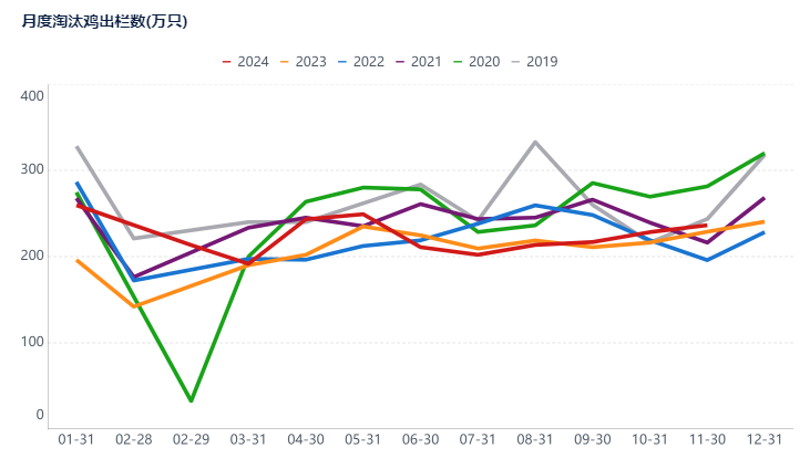 2.钢联数据显示,11月全国10个重点产区19个代表市场的淘汰鸡总出栏量236.39万只,环比增加3.49%,淘汰鸡出栏增加明显。前期蛋价处于较高位置,养殖盈利相对可观,养殖单位对淘汰鸡的出售意愿并不强烈,刺激养殖场不断延养,因此淘汰鸡出栏量有限,淘汰鸡价格随之上涨。随着蛋价、淘汰鸡价格双双下跌,蛋鸡养殖盈利略减少,养殖单位对后市预期收窄,惜售延淘情绪减弱,养殖单位计划在价格高位时变现,多顺势淘汰大日龄以及产蛋率偏低的蛋鸡,因此淘汰鸡出栏量阶段性增加。