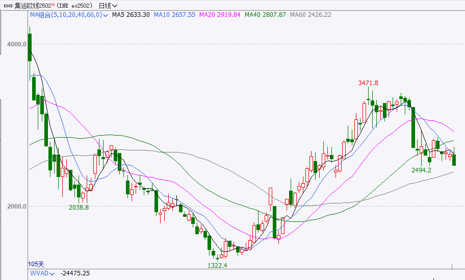 集运主力合约日中维持震荡走势,尾盘承压跳水,收于2505点,跌幅为4.29%。远月合约受地缘情绪扰动,全天交易氛围偏弱,整体跌幅更为显著。