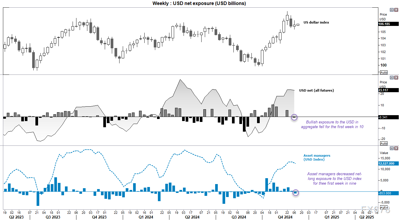 上周美元仓位出现了一些微小但潜在重要的迹象,表明美元将面临一些调整。资产管理公司在9年来的第一周削减了净多头敞口,交易员在10年来的第一周总体上不那么看好美元。