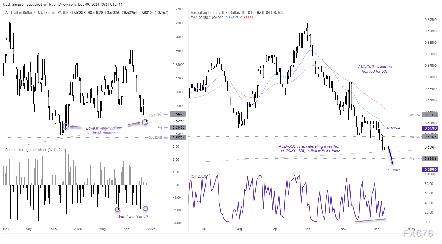 随着价格测试2022年的趋势支撑,鉴于澳洲联储降息的可能性不断上升,美国经济数据强劲,跌破这一支撑的可能性似乎更大。