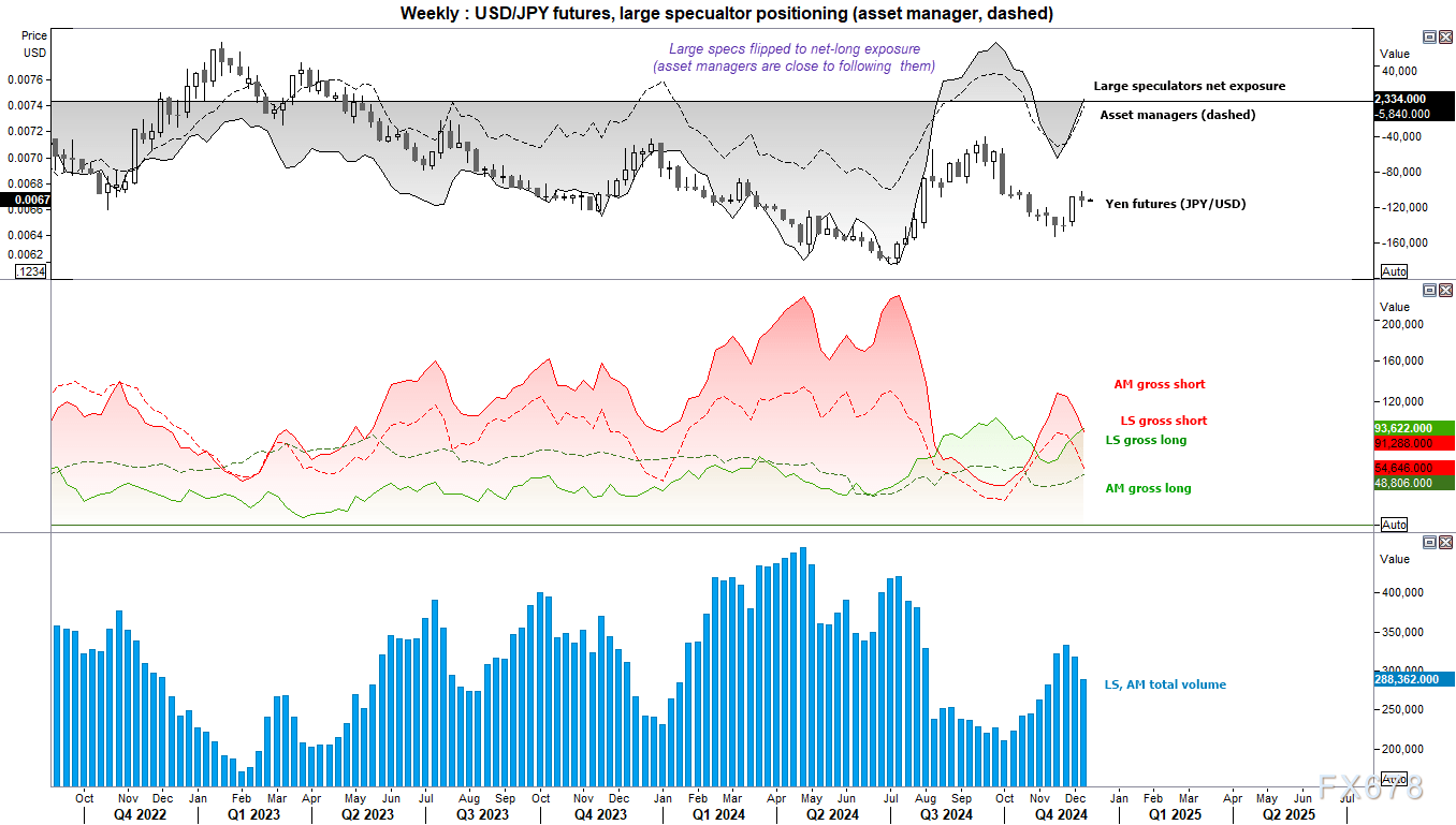大型投机客六周来首次转为净做多日元期货。在过去的两周里,市场持仓发出了信号。看涨头寸当然并不极端,只有2.4万份合约,但鉴于日本央行加息的可能性,以及资产管理公司净空头仅为5.8万份合约,鉴于特朗普第二任期可能面临的动荡,我们可能会在新年伊始看到日元走强。