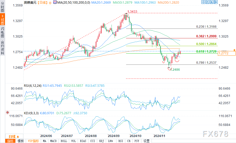 美元反弹后,英镑/美元回撤至4月至9月上升趋势的0.786斐波纳契水平1.2487,形成3波修正形态(艾略特波浪理论中的ABC)。英镑/美元已经从1.2487低点反弹,可能形成一个倒头肩底形态。然而,确认需要突破颈线1.2770。