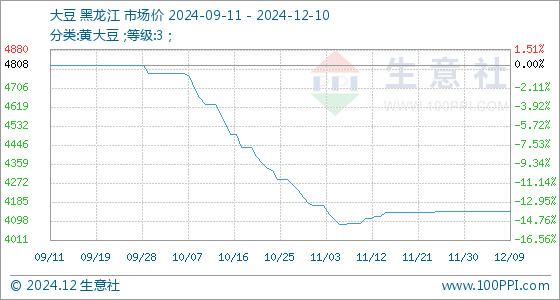 12月10日,生意社大豆基准价为4140.00元/吨,与本月初持平。