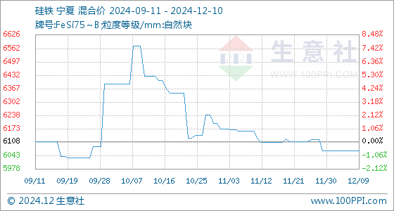 12月10日,生意社硅铁基准价为6064.29元/吨,与本月初(6067.14元/吨)相比,下降了-0.05%。