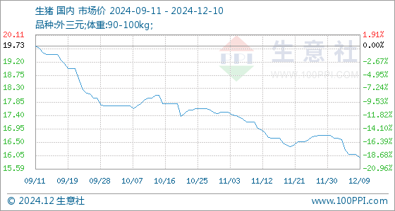 12月10日,生意社生猪基准价为15.97元/公斤,与本月初(16.72元/公斤)相比,下降了-4.49%。