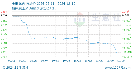12月10日,生意社玉米基准价为2057.14元/吨,与本月初(2112.86元/吨)相比,下降了-2.64%。