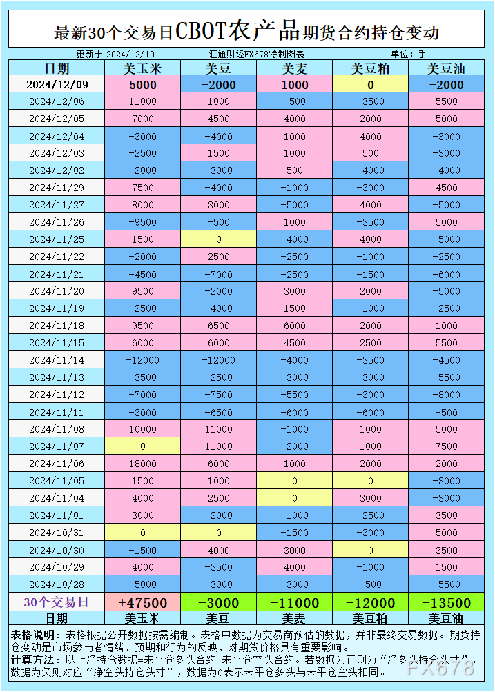 展望未来,CBOT谷物市场走势将受到多重因素的影响。从短期来看,玉米和小麦的价格可能继续受到基本面支撑,而大豆和豆油则需等待南美作物的进一步消息。中长期而言,基金持仓的趋势性变化值得持续关注,尤其是大豆和豆油的空头头寸是否会引发市场结构性的调整。此外,全球宏观经济环境及美联储政策动向对商品市场的流动性和整体风险偏好也不可忽视。