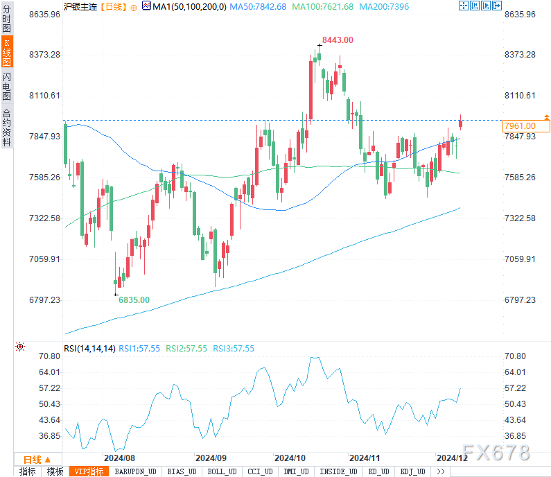 沪银涨幅达到2.32%,受益于国内经济刺激政策对工业需求的拉动。与此同时,国际银价因避险和商品属性的双重驱动录得较大涨幅。近期美联储降息预期升温也对贵金属价格构成支持。沪银的金融属性和商品属性叠加驱动使其未来走势可能随宏观政策和国际金属价格波动而震荡偏强。