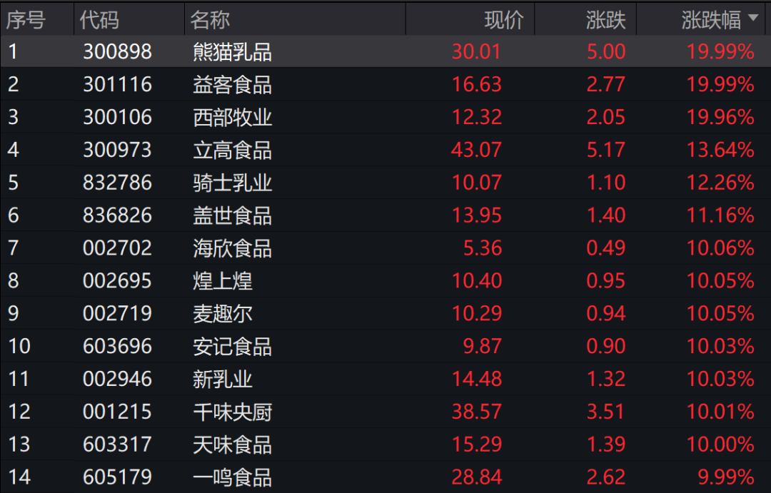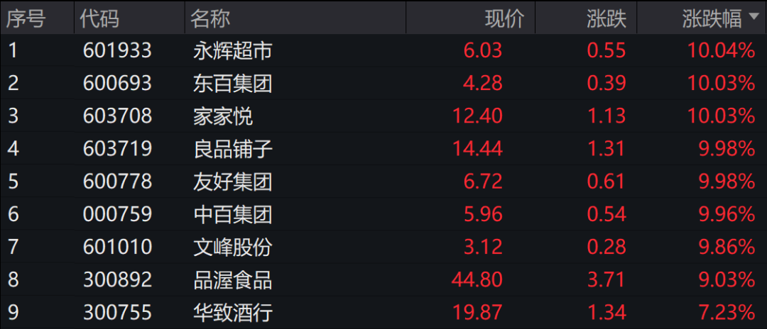 此外,熊猫乳品、永辉超市、同庆楼等20余股涨停。