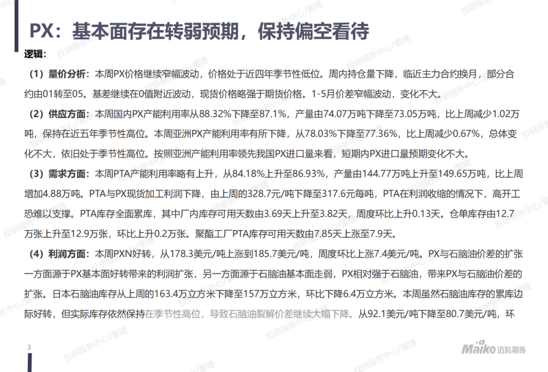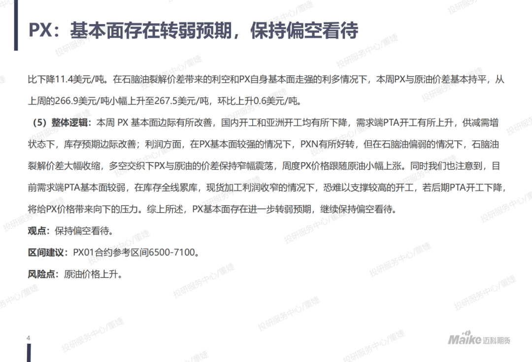 【迈科PX周报】基本面存在转弱预期,保持偏空看待