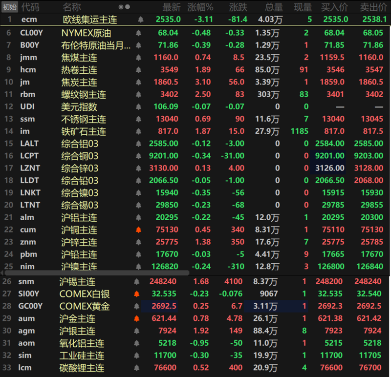 此外,碳酸锂涨0.52%,工业硅跌0.3%,欧线集运主连跌3.11%。