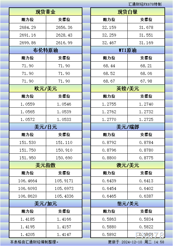 汇通财经APP讯——12月10日欧市更新的黄金、白银、原油、美元指数、欧元、英镑、日元、瑞郎、澳元、加元、纽元支撑阻力位一览。