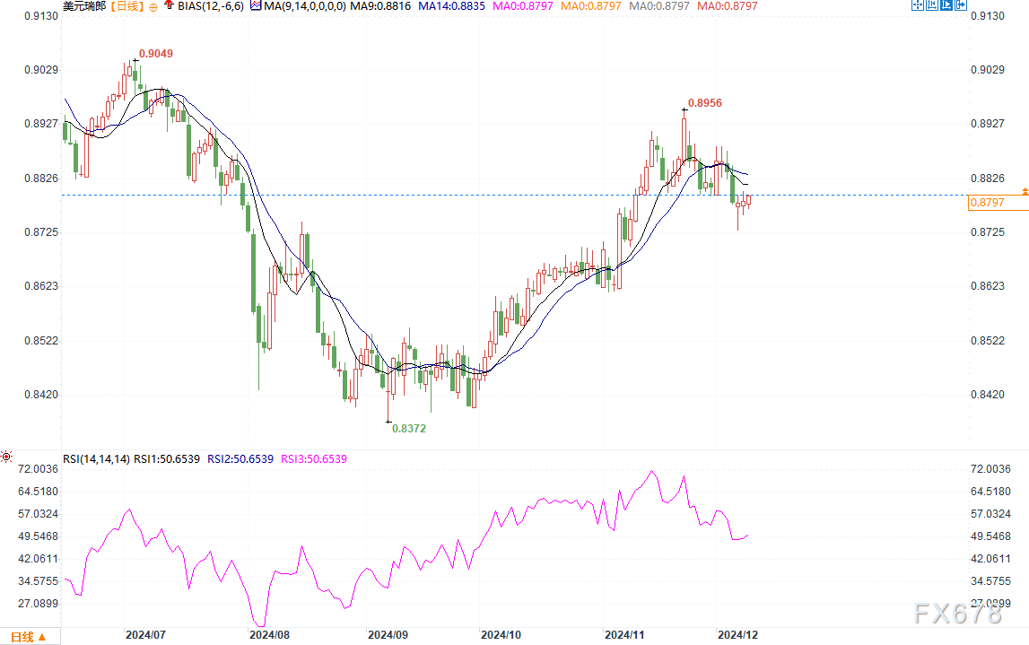 与此同时,市场预期瑞士央行将在12月会议上降息25个基点至0.75%,路透社调查显示,超过85%的经济学家支持这一预测。然而,降息可能削弱瑞郎的吸引力,为美元兑瑞郎提供支撑。此外,因交易员押注美联储本月降息25个基点的概率已接近85.8%,美元表现强势。本周三即将公布的美国11月CPI数据将成为市场的关键指引。