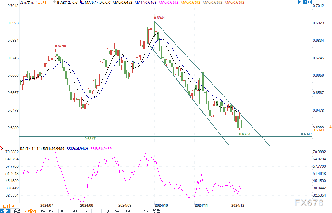 受上述因素影响,澳元兑美元跌破0.6450,创下五个月新低,目前交易价格接近0.6388。技术方面,分析师Akhtar Faruqui认为:澳元兑美元仍处于下降通道内,14日RSI低于50,表明市场情绪仍偏空头。接下来可能进一步测试年度低点0.6348甚至下降通道的下边界约0.6225;阻力方面,阻力位分别位于9日和14日均线,突破后或将挑战五周高点0.6687。