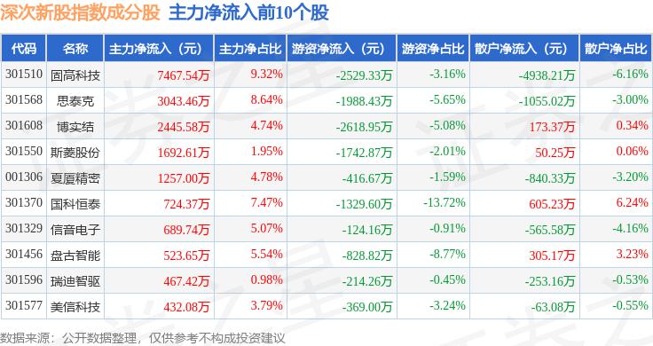 资金流向方面,深次新股(399678)指数成份股当日主力资金净流出合计4.14亿元,游资资金净流出合计1926.9万元,散户资金净流入合计4.33亿元。成份股资金流向详情见下表: