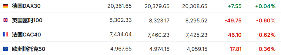 2. 截至发稿,德国DAX指数涨0.44%,英国富时100指数跌0.60%,法国CAC40指数跌0.62%,欧洲斯托克50指数跌0.36%。