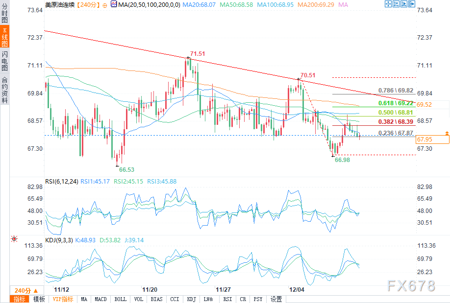 北京时间20:03,WTI原油报68.04美元每桶,跌幅0.48%。