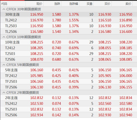 在上述消息提振下,12月10日,债券市场再次走牛,30年期、10年期、5年期、2年期等国债期货价格均创历史新高。截至收盘,30年期国债期货主力合约涨1.37%,报116.95元,盘中一度涨超1.6%;10年期国债期货主力合约涨0.67%,报108.215元;5年期国债期货主力合约涨0.41%,报106.16元;2年期国债期货主力合约涨0.13%,报102.832元。