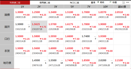 银行间主要利率债收益率快速下行。截至发稿,30年期国债活跃券收益率下行5.9个基点,报2.051%;10年期国债活跃券收益率下行6.8个基点,报1.837%;5年期国债活跃券收益率下行6个基点,报1.51%;2年期国债活跃券收益率下行6.25个基点,报1.25%。