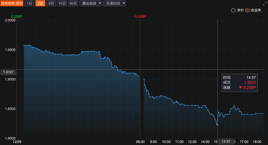回顾整个交易日行情,10年期国债到期收益率整体呈下行态势,但下午15:00左右,债市情绪迎来一定反转,导致收益率在抵达1.82%前止步,出现小幅上行后,稳定在1.84%左右位置。