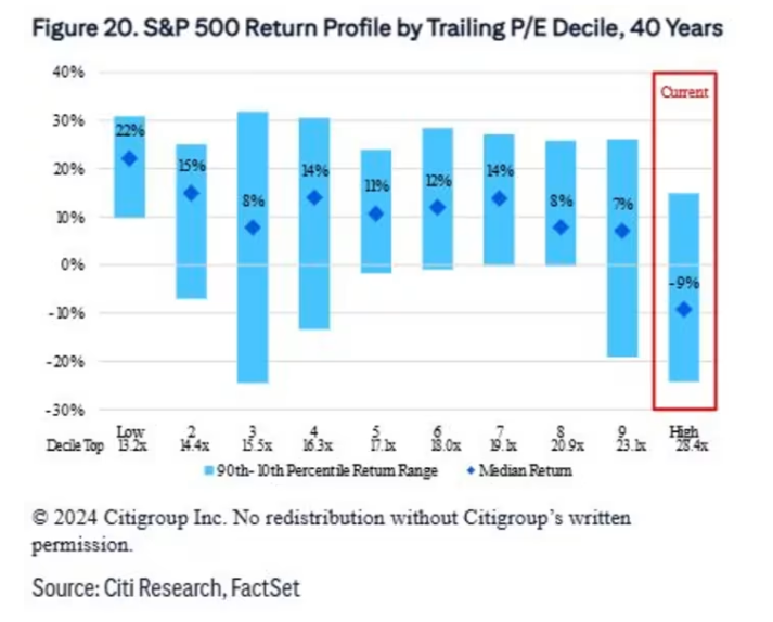 花旗将注意力集中在对2025年的估值担忧上。Chronert和他的同事说,“美股的市盈率目前处于历史最高的十分位数(在一组数据从小到大排列后位于前十分之一位置的数值),这是过去40年估值达到如此高位时唯一一次的风险回报为负。在这种情况下,中位数回报率往往为负数,潜在的下行亏损大于上行收益。”