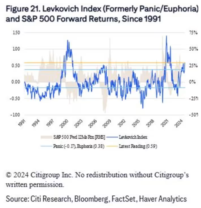 他们还表示,目前投资者的自满情绪将为股市上涨设置“高门槛”。他们的列夫科维奇指数(Levkovich Index)——前身为恐慌/乐观指数——显示投资者正处于“仅次于科技泡沫和新冠疫情后反弹的乐观阶段”。