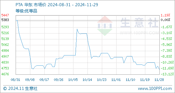 11月29日,生意社PTA基准价为4741.00元/吨,与本月初(4901.00元/吨)相比,下降了-3.26%。