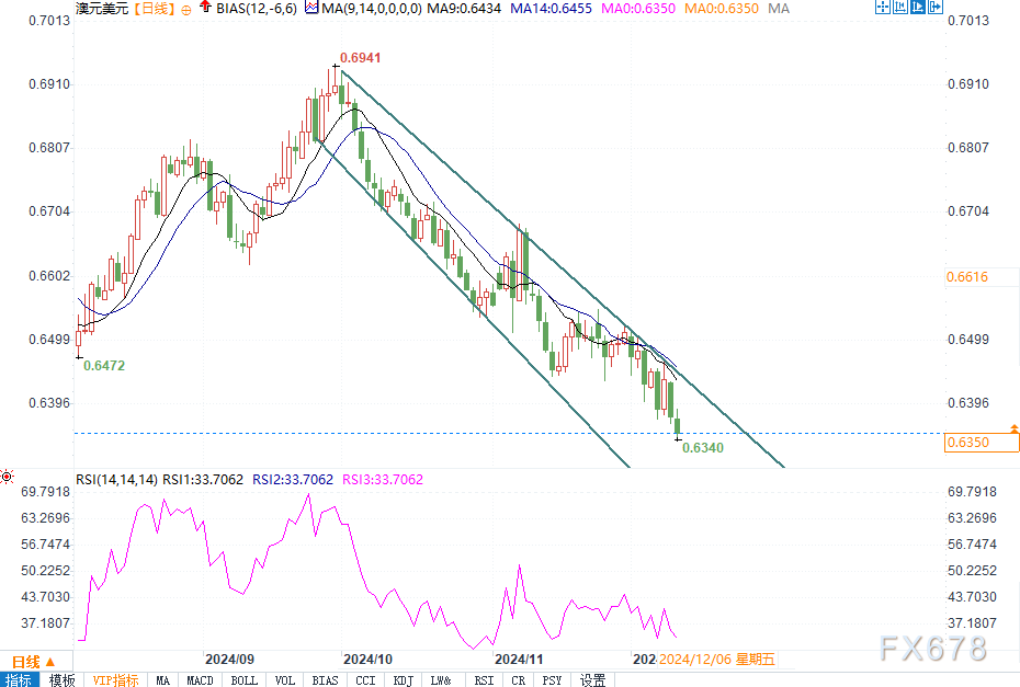 12月11日周三,澳元/美元徘徊在0.6350附近。日线图的技术指标显示,随着汇率在下降通道内持续下行,空头动能正在加强。此外,14天RSI略高于30,表明市场情绪仍偏空;