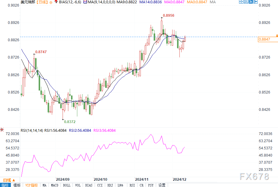12月11日周三欧洲早盘时段,美元/瑞郎徘徊在0.8850附近,连续第四天上行。汇价的上涨受到美元走强的支撑(得益于市场对美联储采取较少鸽派立场的预期升温)。市场密切关注将于12月11日21:30发布的美国11月消费者价格指数(CPI)数据,随后注意力将转向本周四瑞士央行的利率决议。