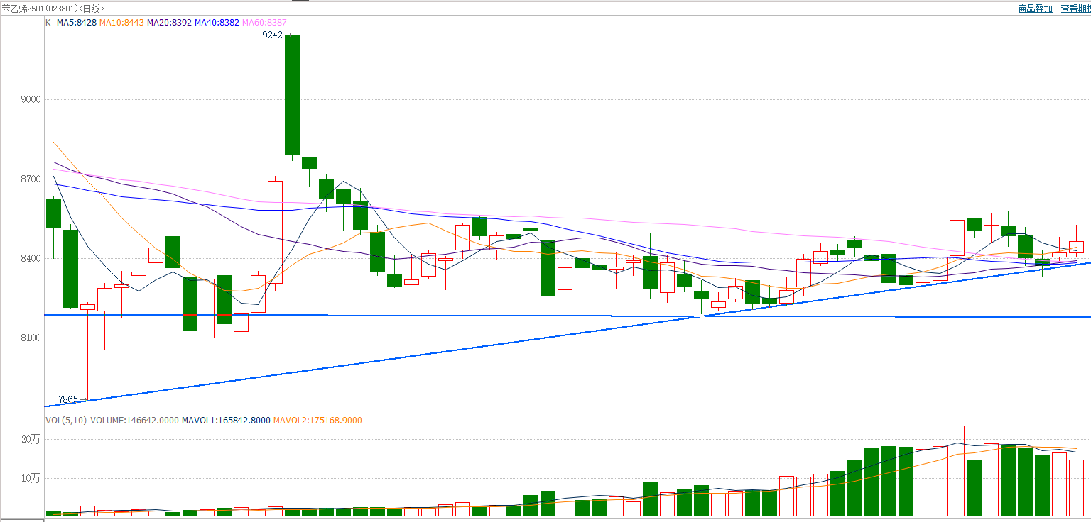 截至前一个交易日收盘,苯乙烯震荡上行,收小阳线。日k线底部反弹,60日均线附近存在一定支撑。