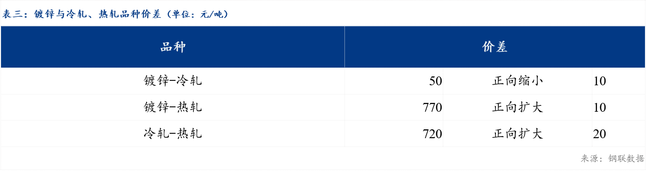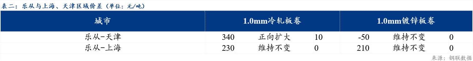 今日冷轧板卷乐从与天津价差较上一交易日扩大10元/吨,乐从与上海价差较上一交易日持平;镀锌板卷乐从与天津价差较上一交易日持平,与上海价差较上一交易日持平。品种价差方面,镀冷价差较上一交易日收窄10元/吨,镀热价差较上一交易日扩大10元/吨,冷热价差较上一交易日扩大20元/吨。