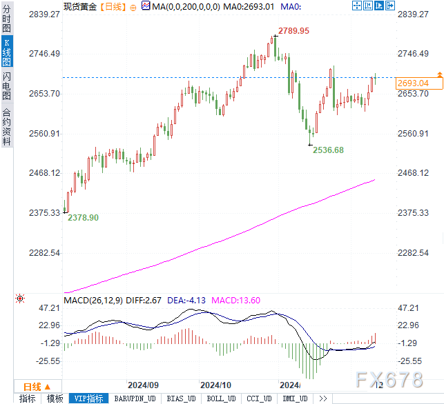 现货黄金价格微跌0.03%,报2693.36美元/盎司,市场整体交投谨慎。在CPI数据公布前,投资者对美联储政策前景的评估将对金价走势形成重要影响。
