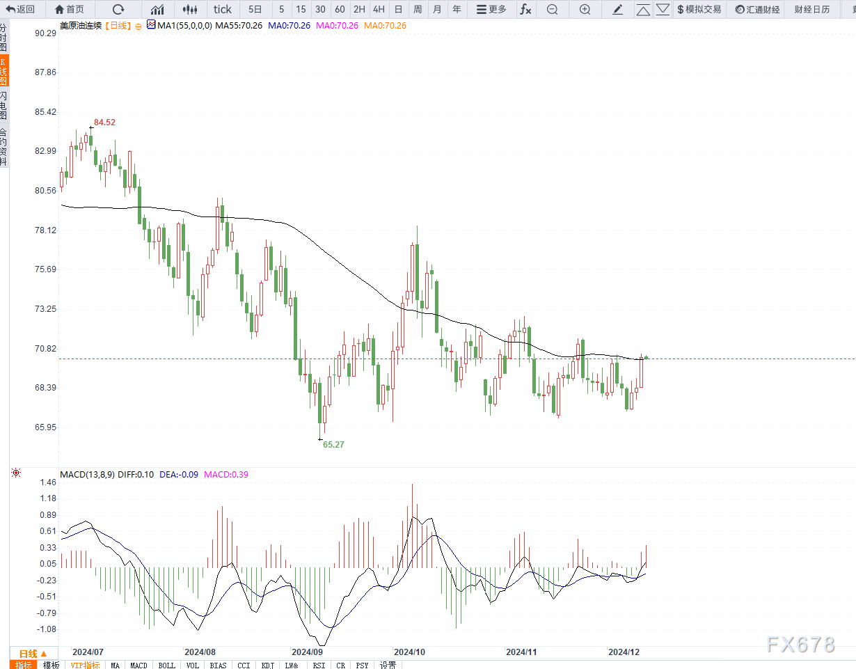 汇通财经APP讯——周四(12月12日)美原油亚盘时段小幅回落,交投于70.18美元/桶附近,基本面上美国上周EIA原油库存减少142.5万桶,预期减少90.1万桶,前值减少507.3万桶。