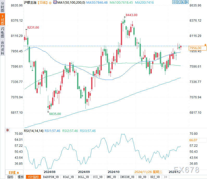 沪银昨日变动有限,受到国际银价的横盘整理影响。尽管通胀数据对贵金属整体利好,但白银的工业属性限制了其涨幅。此外,国内经济刺激政策的提振作用尚需时间显现,对白银需求的支持力仍显不足。