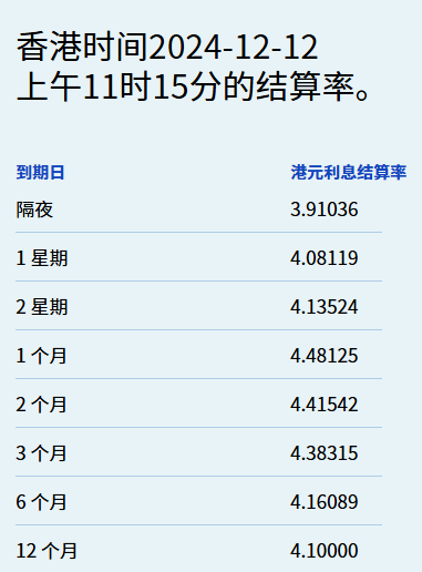 12月12日,港元短息下跌,中长息则继续上升。其中,隔夜息回落8基点至3.91036厘,但与楼按相关的一个月拆息却连升四天,报4.48125%,创近两个半月新高。