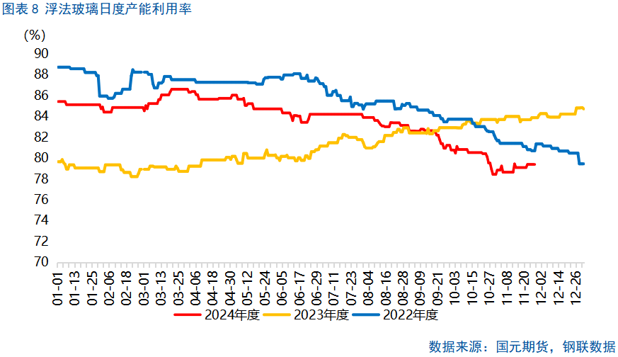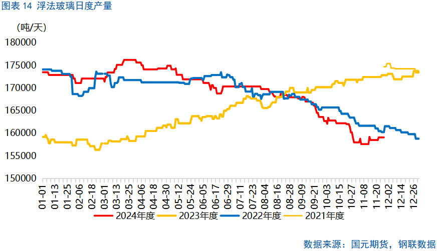 纯碱下游消费结构中最重要的为玻璃,浮法玻璃消费占比约为42%,光伏玻璃占比约为13%,日用玻璃占比约为17%,三者合计占比达到约72%。2024年1-11月份,我国浮法和光伏玻璃产能利用率均呈现下滑趋势,但节奏呈现分化。自2024年3月末起,浮法玻璃产能利用率便迅速下降,至11月下旬跌幅达到7.2个百分点,步入2025年,我们预期浮法玻璃产量易跌难涨。