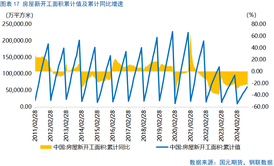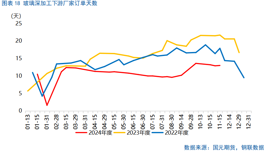 房地产竣工端为浮法玻璃的最大下游,2024年,受制于房地产竣工端表现不佳,浮法玻璃消费表现较弱。据钢联数据统计,用于建筑的玻璃占玻璃下游消费的88%。2024年1-10月,中国房屋竣工面积累计值在41995.15万平方米,累计同比下跌23.9%。房地产新开工至竣工期间需要经历约24-36个月,2022年,房屋新开工面积降幅达到39.4%,意味着2025年房屋竣工表现承压,浮法玻璃需求或延续下行。同时,影响浮法玻璃需求的还有房地产相关政策,尤其是针对于竣工相关的政策,2025年一季度末,国内重要会议所出台的相关政策值得密切留意,其可能会对浮法玻璃市场产生提振。