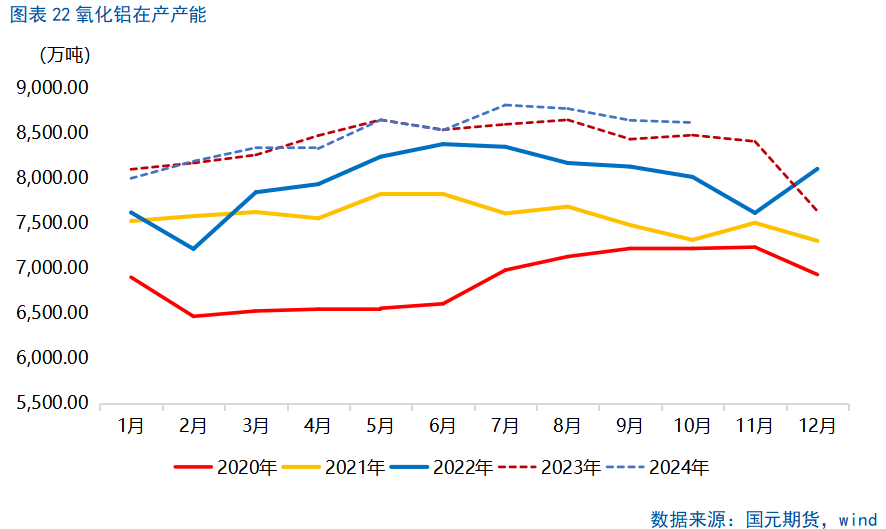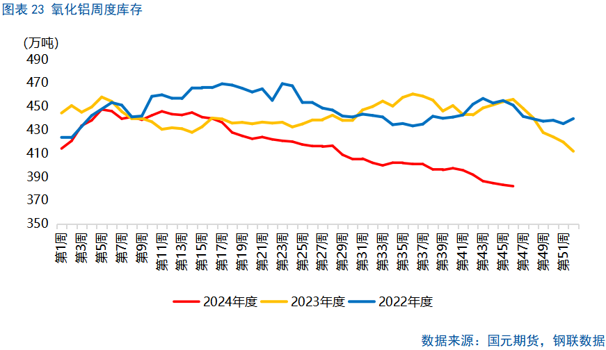 据中国海关总署,2024年1-10月,中国累计进口铝土矿13174万吨,同比增加12.0%。分国别看,自几内亚进口铝土矿9209万吨,占进口总量的69.9%,同比增加11.1%;自澳大利亚进口铝土矿3300万吨,占进口总量的25.05%,同比增加18.34%;非主流进口铝土矿总量665.3万吨,占进口总量的5.05%,较2023年同期非主流铝土矿进口总量(不含印尼进口矿)增加33.8%。非铝需求方面,印染行业对烧碱需求同比增加。根据国家统计局数据,2024年1-9月,印染行业规模以上企业印染布产量416.22亿米,同比增长2.94%,不过增速较上半年回落1.04个百分点。截至11月,液碱场内库存在24.95万吨,较年初下滑38.83%,同比下滑19%。