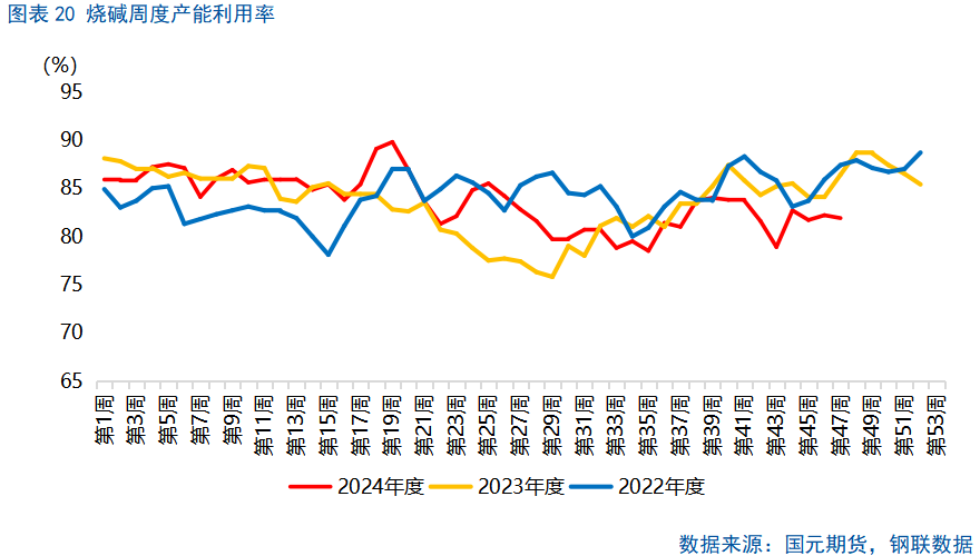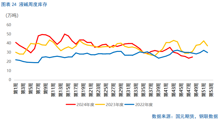 2025年,预计非铝需求下游终端涉及纺织服饰消费等行情,其出口依赖度约为二成,随着美国关税政策落地,海外消费韧性降低,将一定程度上对非铝需求增速形成拖累。但是,随着进口铝土矿数量增长,氧化铝持续投产,国内铝土矿需求将增加,对于配比使用的烧碱需求也将有所增加,烧碱最大下游氧化铝需求有望提升。综合来看,步入2025年,烧碱需求整体仍然向好,液碱库存有望维持在偏低水平。