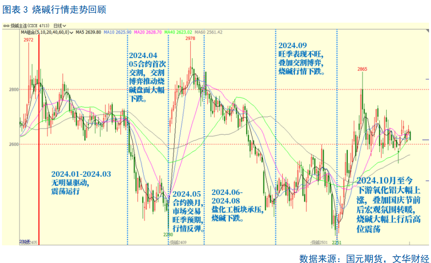 2024年一季度,无明显驱动,震荡运行。2024年4月,烧碱2405合约首次交割,交割博弈推动烧碱盘面大幅下跌;2024年5月后,烧碱主力合约换月,市场交易“金九”旺季预期,行情反弹;2024年6-8月,盐化工板块承压下滑,烧碱跟跌。2024年9月,烧碱旺季表现不旺,叠加交割博弈,烧碱行情下跌。2024.10月至今,下游氧化铝大幅上涨,叠加国庆节前后宏观氛围转暖,烧碱大幅上行后高位震荡。