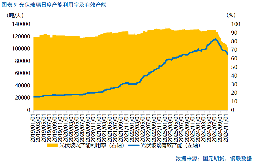 而自2024年7月起,光伏玻璃产能利用率急剧下滑,至11月下旬跌幅达到22.56个百分点。9月初十大光伏玻璃生产厂商召开会议,实施封炉减产30%计划,进一步推动光伏玻璃产量的下滑。截至2024年11月,据我们测算,光伏玻璃日产量已经较7月初的高点下跌约24.8%,较9月初减产幅度超过13%。同时,在政策上,2024年11月15日财政部、国家税务总局公告,将部分光伏产品出口退税率由13%下调至9%,涉及硅片、电池片、组件等产品,自2024年12月1日开始实施,2025年,该政策将带动光伏行业加速产业升级、推动落后产能出清,光伏玻璃作为配套产品,产能也将实现优化,年内或延续减产。