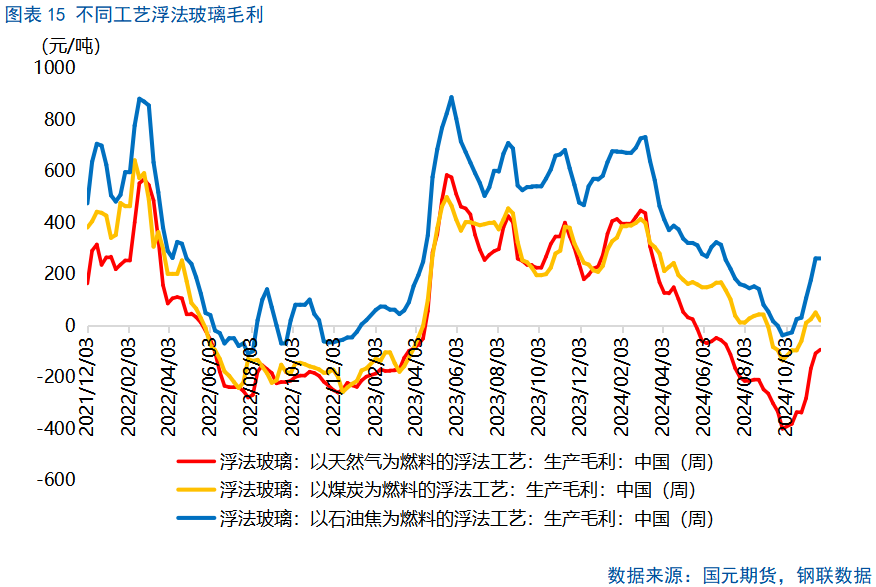 2024年1-10月,浮法玻璃年内累计产量已经达到5197.75万吨,同比上涨4.46%。截至11月底,浮法玻璃日平均产能利用率达到83.7%,同比增加了2.47个百分点,其中供应的增加主要源于一季度。在上文我们提到过,2024年3月末至11月下旬,浮法玻璃产能利用率大幅下跌7.2个百分点。实际上,当时浮法玻璃库存大幅上升,同时利润也持续压缩,据统计,煤制浮法玻璃利润大幅下跌116元/吨,跌幅达到30%,这种产业链的低迷态势促使浮法玻璃企业纷纷采取堵窑口等措施以降低产量,致使部分产线产能被淘汰。