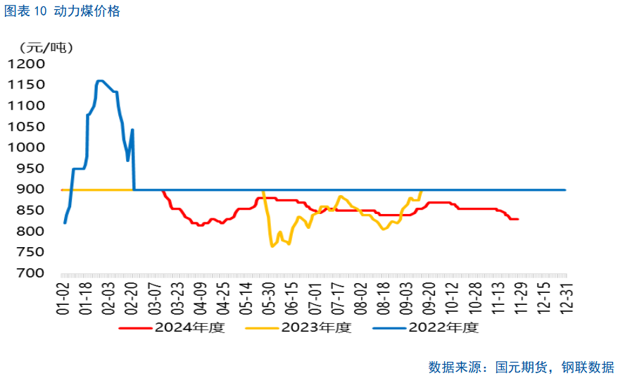 纯碱的主要原材料成本为原盐及动力煤等。从原盐来看,2024年1-9月,中国原盐产量累计达到4385.2万吨,而中国原盐表观消费量达到5281.46万吨,供需比为0.83,略低于往年平均水平,呈现出供需平衡偏紧。2024年以来,西北原盐价格由255元/吨上涨至275元/吨,环比略有上涨。不过,由于部分企业自带制盐装置,原盐单耗少且单价相对稳定,因此原盐对纯碱成本的影响相对较少。从动力煤来看,截至11月,2024年动力煤价格呈现下滑,秦皇岛港Q>5500动力煤参考价格从900元/吨下滑至830元/吨。2025年,动力煤预计继续执行长协,价格或整体维持震荡局面。步入2025年,我们认为纯碱成本端波动影响较为有限,原盐及动力煤价格将呈现窄幅震荡。