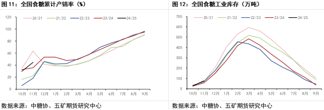 由于甘蔗收购价格提高,玉米、木薯、桉树、果树等竞争作物收益下降,企业有给农民发放果树改种甘蔗的种植补贴,以及广西2024年增加补贴强制引导农民减少桉树种植改为种植甘蔗,使得糖料种植面积较大幅度提高。据11月全国产销会信息估算,2024/25年制糖期全国食糖产量预计为1105万吨,同比增加约109万吨,或10.94%。虽然国内高产,但是目前消费也不错,产销两旺,产销进度同比明显加快。据中国糖业协会数据显示,2024/25年制糖期甜菜糖厂已全部开机生产,甘蔗糖厂也陆续开榨。截至11月底,全国共95家糖厂开机生产。其中,甜菜糖厂28家,甘蔗糖厂67家。全国共生产食糖136.79万吨,同比增加48.16万吨,增幅54.34%;累计销售食糖60.9万吨,同比增加29.22万吨,增幅92.23%;累计销糖率44.52%,同比加快8.78个百分点。