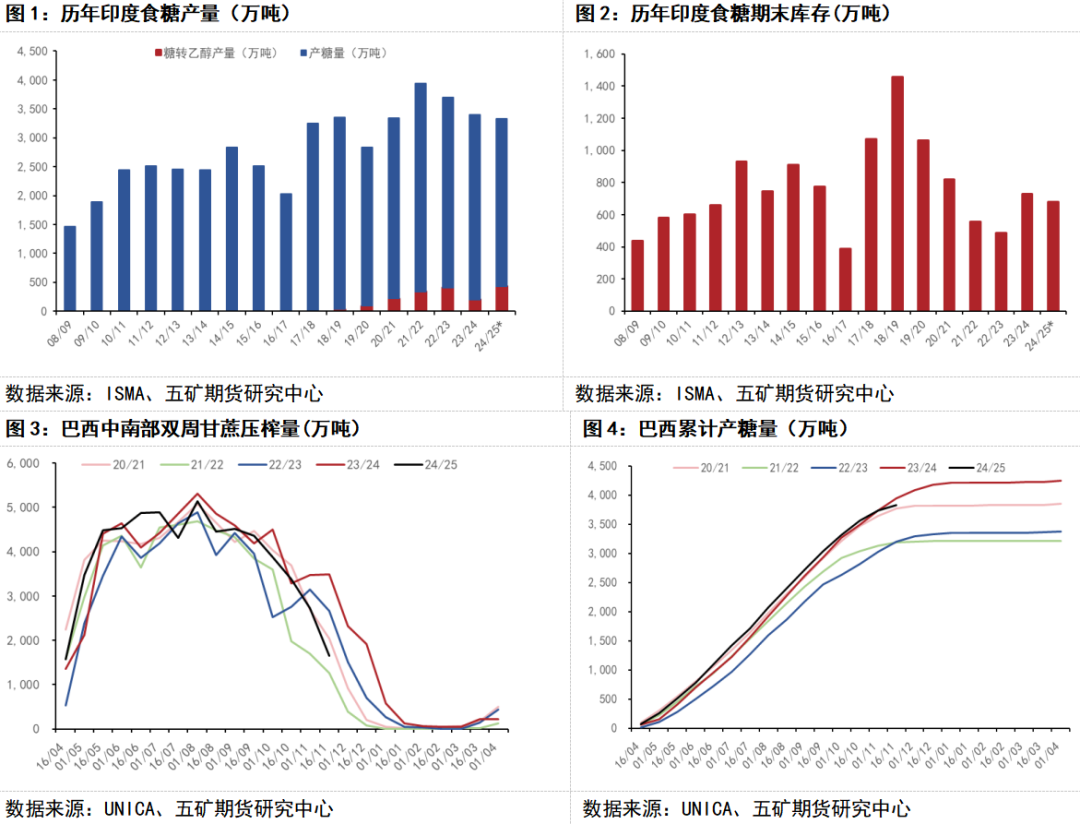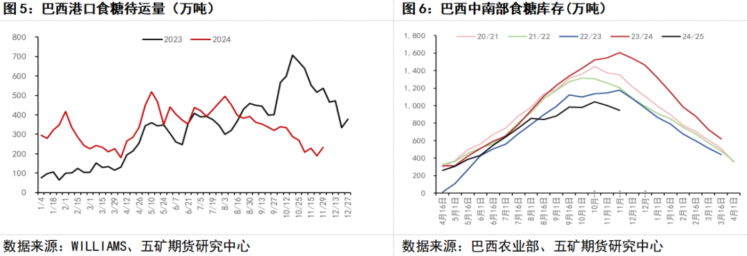 巴西方面,2024/25年度甘蔗压榨量和产糖量都处于历史高位,但由于前期干旱和火灾的影响,导致甘蔗质量下降,使得制糖比例下滑,10月后产糖量呈快速下滑趋势,就目前而言产量同比略减。据UNICA最新数据显示,2024/25榨季截至11月上半月,巴西中南部地区累计入榨量为58260.7万吨,较去年同期的59597.1万吨减少1336.4万吨,同比降幅2.24%。累计产糖量为3827.4万吨,较去年同期的3947.3万吨减少119.9万吨,同比降幅3.04%。11月上半月,巴西中南部地区甘蔗入榨量为1646万吨,较去年同期的3488.3万吨减少1842.3万吨,同比降幅52.81%。产糖量为89.8万吨,较去年同期的219.9万吨减少130.1万吨,同比降幅59.18%。另一方面,虽然巴西产量大,但出口需求同样旺盛,使得其库存同比减少。航运机构Williams发布的数据显示,截至11月27日当周,巴西港口等待装运食糖的船只数量为60艘,去年同期为112艘。港口等待装运的食糖数量为232.45万吨,去年同期为537.07万吨,同比减少304.62万吨,降幅56.71%。据巴西农业部数据显示,截至11月上半月巴西中南部地区食糖库存量为947万吨,同比减少660万吨,降幅41.07%。