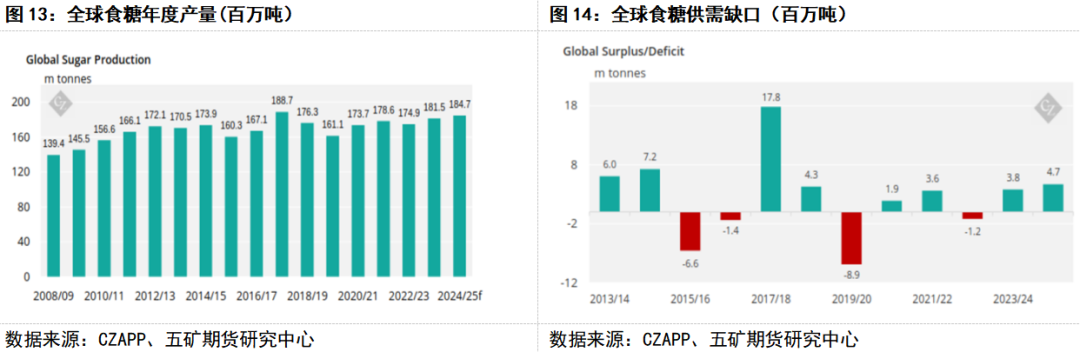 从国内市场来看,新年度供需视糖浆及预拌粉进口是否被管控,分为两种情况,前提条件是以国内产量增104万吨至1100万吨,消费持平为1520万吨,原糖均价18.5美分/磅。假设一,糖浆和预拌粉进口不被管控,并以20%增速(2023/24年度增速为38%)增加至190万吨(折合吨糖数量),食糖进口量略降25万吨至450万吨。即2024/25年度国内供应过剩220万吨,过剩量同比增111万吨,综合糖源成本约5800元/吨。由于过剩幅度明显增加,郑糖价格重心将会跌破综合成本,按历史经验判断将会低于成本150元/吨,至5650元/吨。假设二,糖浆和预拌粉进口被管控,进口大幅降至50万吨(折合吨糖数量),食糖进口量增25万吨至500万吨, 2024/25年度国内供应过剩130万吨,过剩量和上年度接近,综合糖源成本约5900元/吨,而郑糖价格重心接近综合成本。总体而言新年度郑糖价格走势以震荡为主,价格可能会是前高后低,交易价格重心在于判断糖浆和预拌粉进口是否会被管控。
